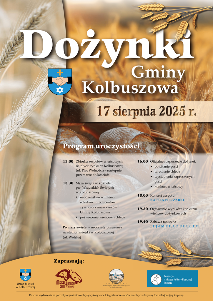 Serdecznie zapraszamy mieszkańców oraz gości do udziału w Dożynkach Gminy Kolbuszowa, które odbędą się w niedzielę, 17 sierpnia w Kolbuszowej. Tradycyjne święto plonów będzie okazją do wyrażenia wdzięczności za tegoroczne zbiory oraz trud pracy rolników.