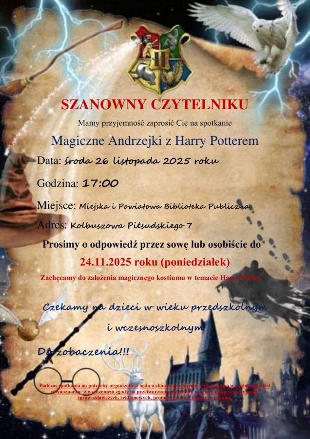 Oddział dla Dzieci i Młodzieży zaprasza na Magiczne Andrzejki z Harry Potterem, które odbędą się w dniu 26 listopada (środa) o godz. 17.00.