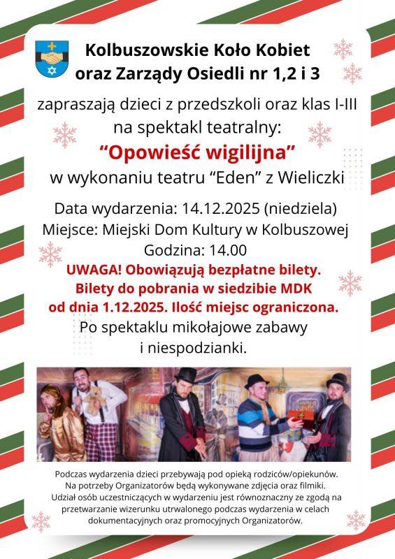 Kolbuszowskie Koło Kobiet oraz Zarządy Osiedli nr 1,2 i 3 zapraszają spektakl teatralny dla dzieci pn. „Opowieść Wigilijna”, który odbędzie się w dniu 14 grudnia o godz. 14.00 w Miejskim Domu Kultury w Kolbuszowej. Wydarzenie skierowane jest dla dzieci przedszkolnych i uczniów klas I-III szkół podstawowych.