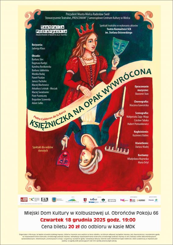 Miejski Dom Kultury w Kolbuszowej zaprasza na spektakl teatralny pt. ,,Księżniczka na opak wywrócona" w wykonaniu aktorów Teatru Rozmaitości SCK im. Stefana Ostrowskiego. Wydarzenie odbędzie się w czwartek, 18 grudnia o godz. 19:00.