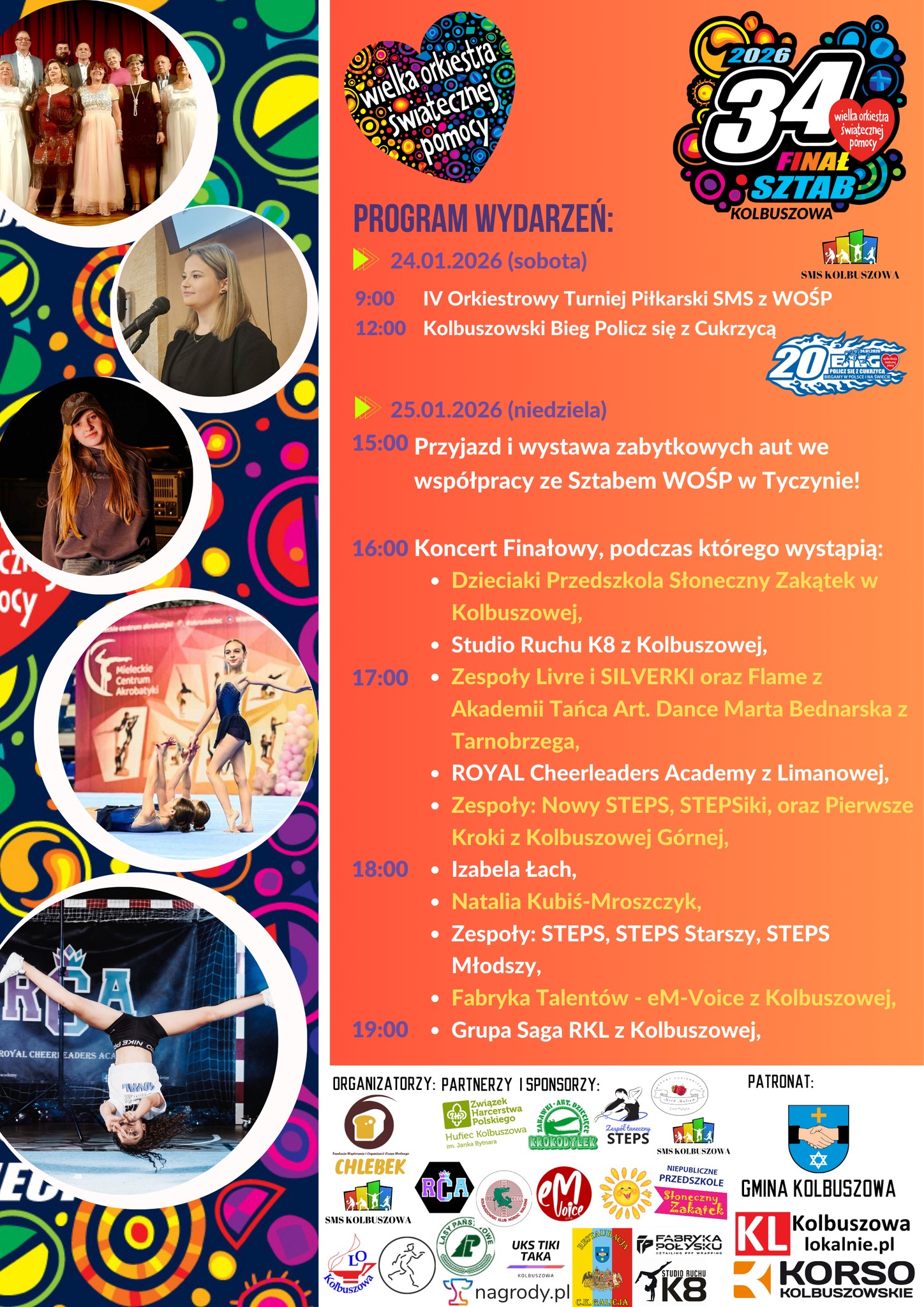 W dniach 24–25 stycznia 2026 r. w Kolbuszowej odbędzie się 34. Finał Wielkiej Orkiestry Świątecznej Pomocy, organizowany przez lokalny Sztab WOŚP Kolbuszowa. Tegoroczna zbiórka prowadzona jest pod hasłem „Zdrowe brzuszki naszych dzieci”, a jej celem jest diagnostyka i leczenie chorób przewodu pokarmowego u najmłodszych pacjentów.