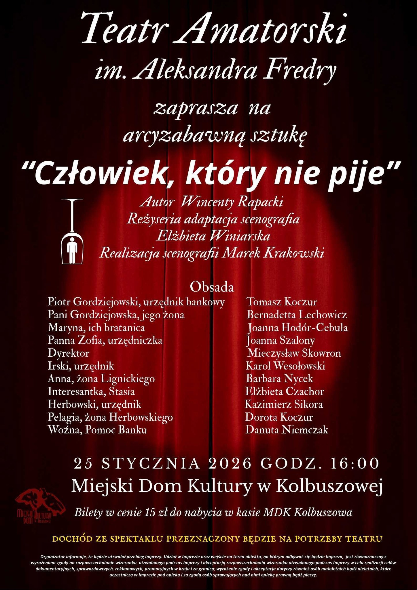 Serdecznie zapraszamy na pełną humoru komedię „Człowiek, który nie pije” w wykonaniu aktorów Teatru Amatorskiego im. Aleksandra Fredry. Wydarzenie odbędzie się w niedzielę, 25 stycznia o godz. 16.00 w Miejskim domu Kultury w Kolbuszowej.
